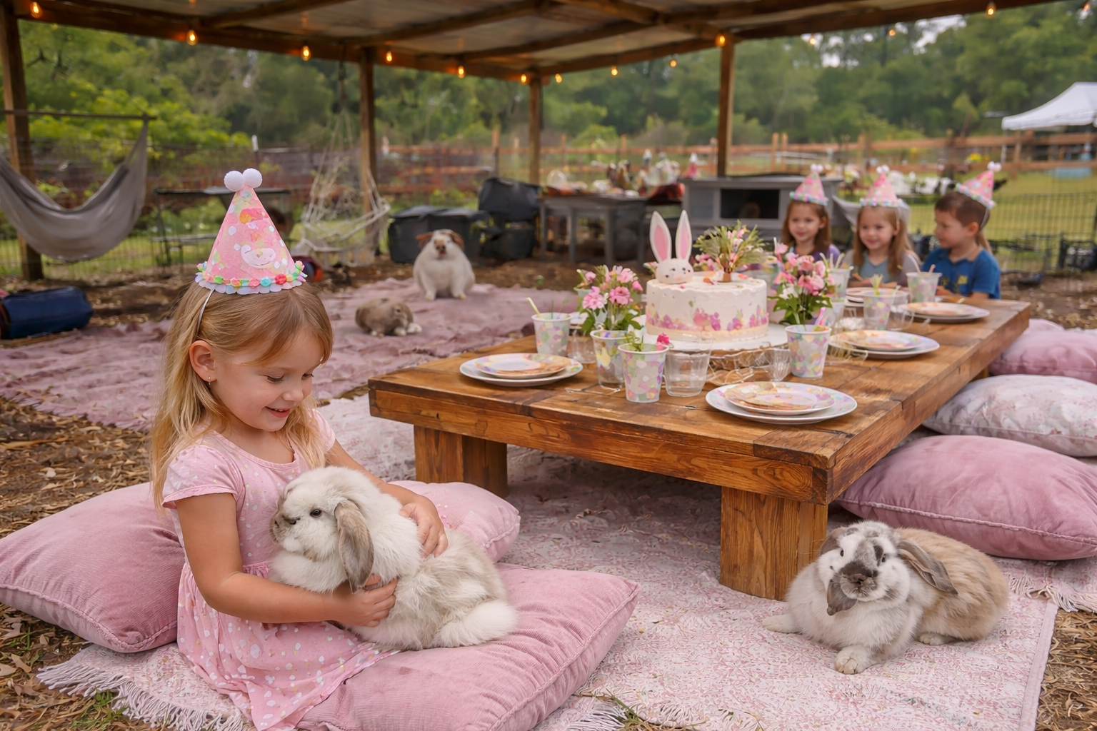 Celebrate with a whimsical picnic set up right near our bunny area, where little guests can enjoy a beautifully styled table and spend time with our adorable animals.