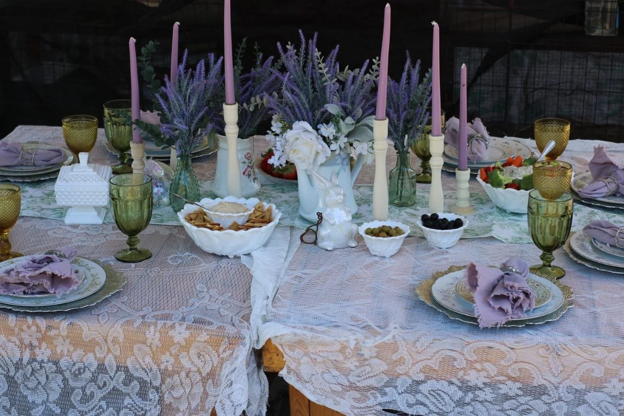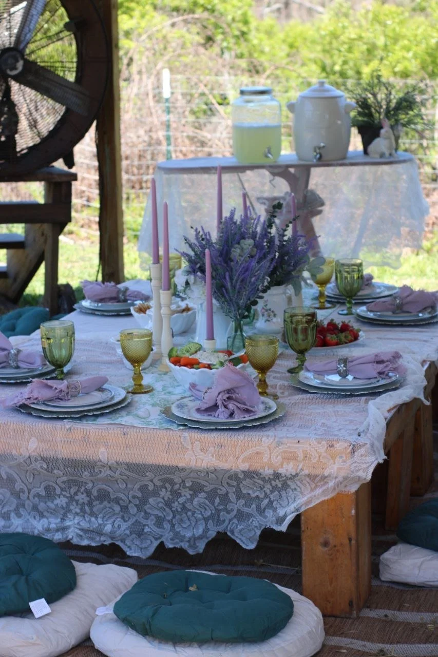 Enjoy a whimsical picnic setup nestled near our bunny area, where guests can relax among soft linens and vintage tableware while experiencing the charm of our petting zoo.